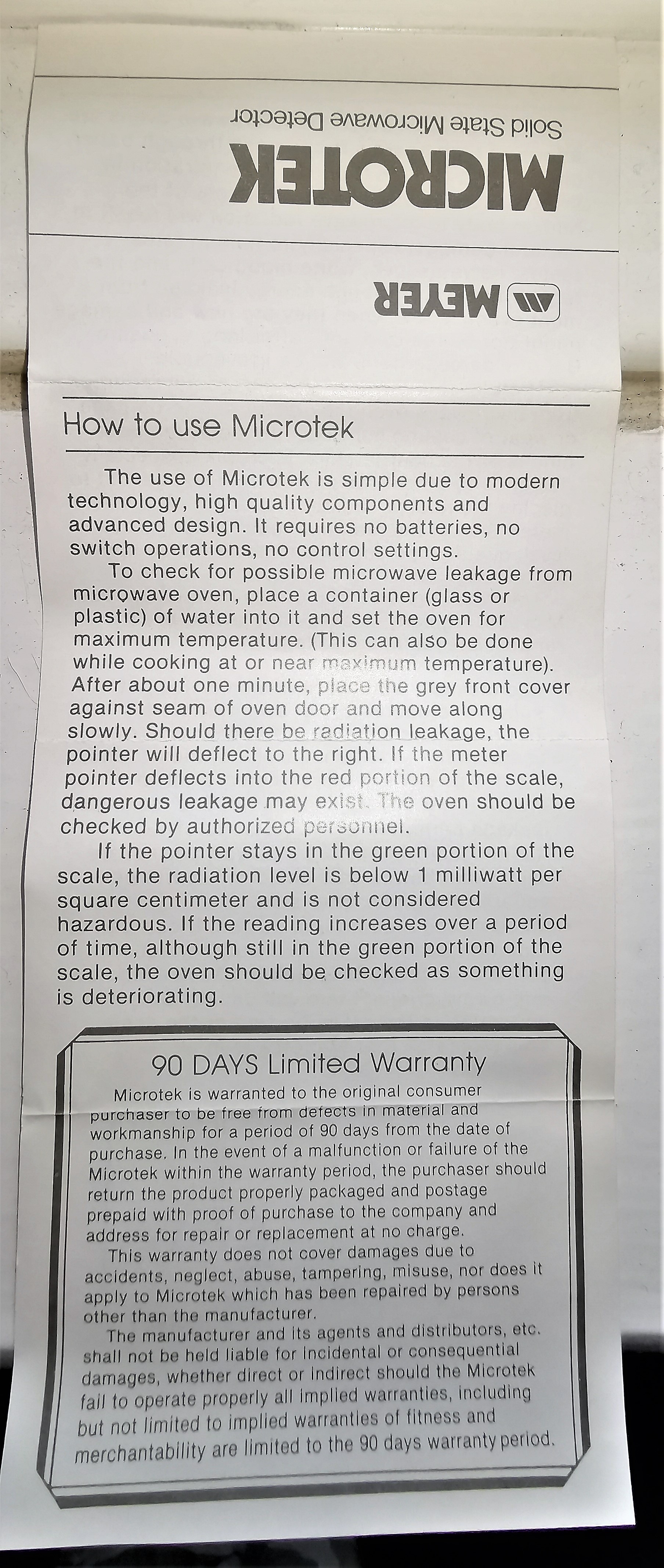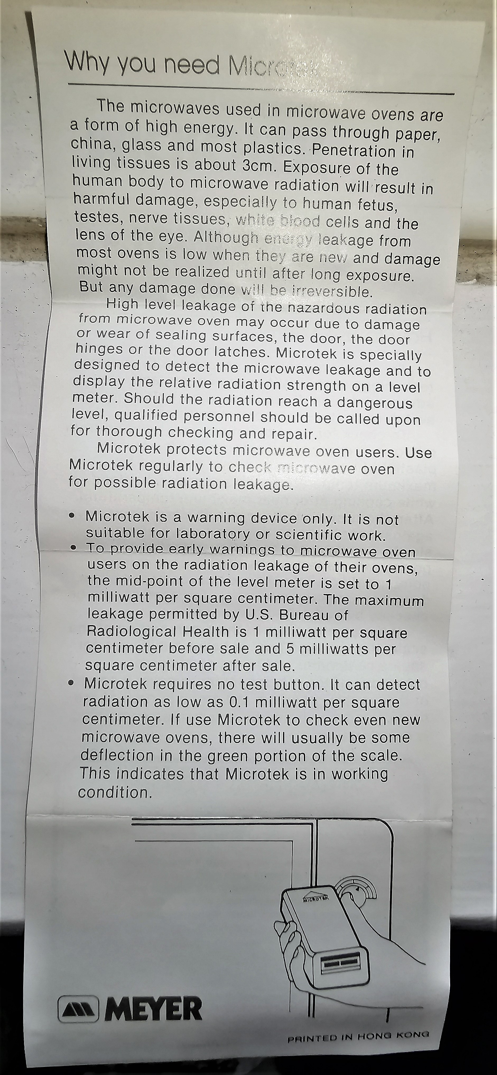 A curious device supposedly for detecting microwave radiation leaking from your microwave oven. Manufactured by Meyer the Microtek is described as a solid state microwave detector. Designed for microwave oven users. Provides you with Safety and Peace-of-mind. Pointing it at my own microwave doesn't elicit any response from the guage so I guess that means either my microwave is safe or this device is snake oil.